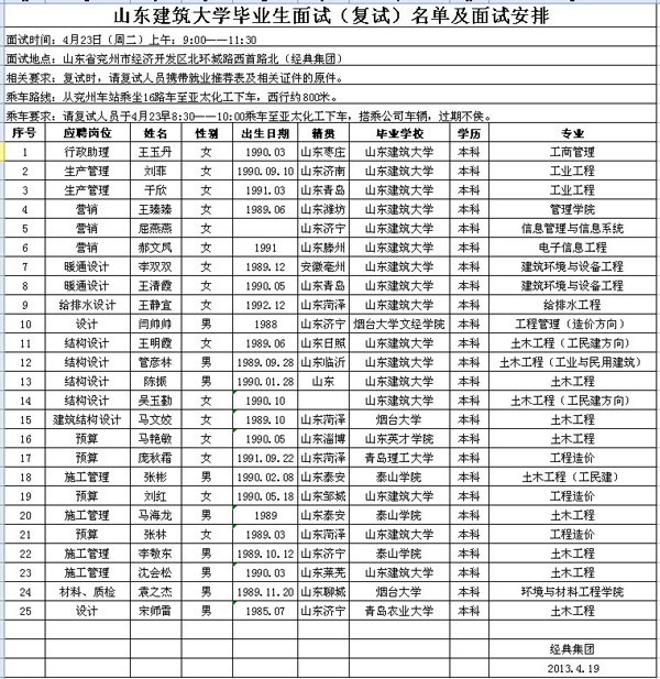 山東建筑大學(xué)畢業(yè)生面試(復(fù)試)名單及面試安排.xls
